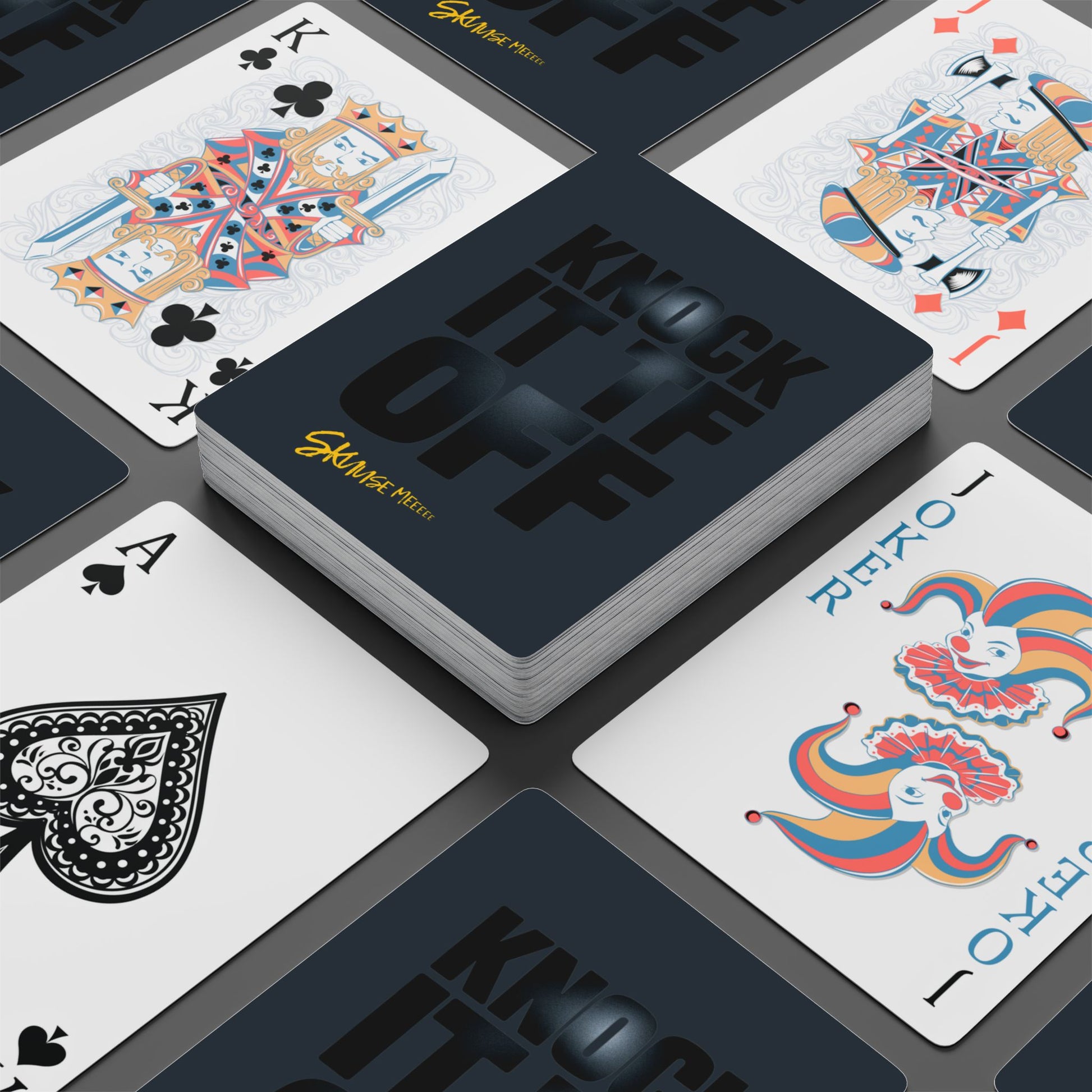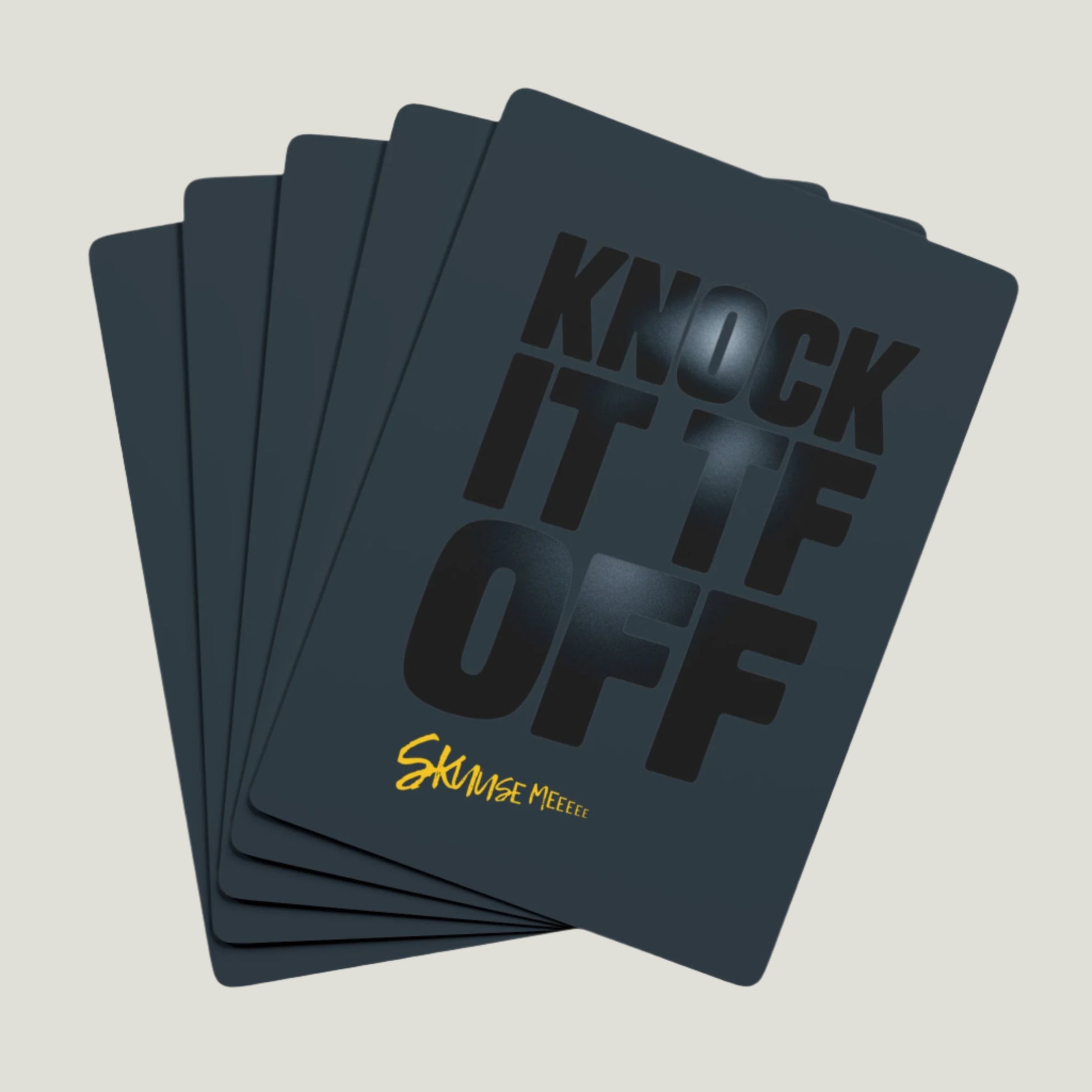Bring the attitude to your game nights with the "Knock It TF Off" Playing Cards! Featuring an unapologetic design, these cards are perfect for players who mean business. Whether you’re dealing out poker, spades, or a casual game of go fish, these cards will make sure everyone at the table knows who’s in charge. Shuffle up and let the games begin!